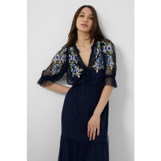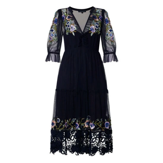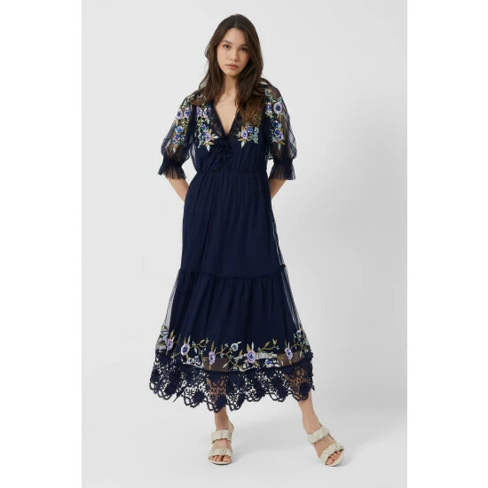 If you are looking for a theatrical piece that will score you compliments at every party as well as in daily life then the Ambre Embroidered Cluster Maxi Dress is the one. Constructed from layers of tulle embellished with sequin flowers and has a matching slip underneath. Its hem is trimmed with a lace panel that will swing in the air with every step.