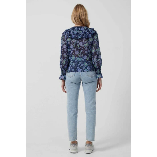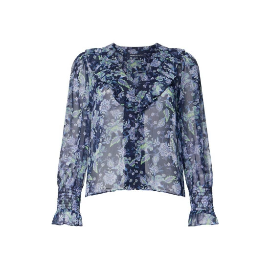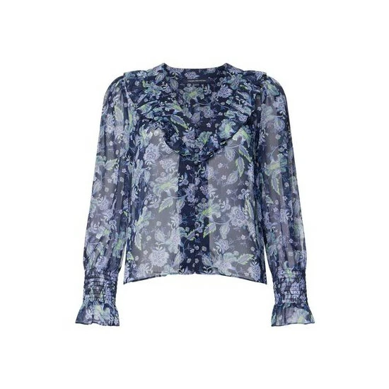 Expand your smart-casual portfolio with our Gloria recycled ruffle top. Its nonchalant silhouette is fitted with long semi-sheer sleeves and ruffled trim around the front to highlight its romantic charm. Crinkle top featuring long sleeves, V-neckline, button-front fastening, floral print and ruffled trim.