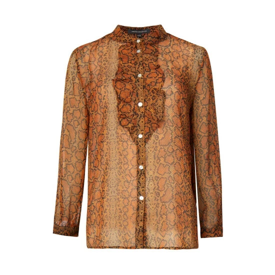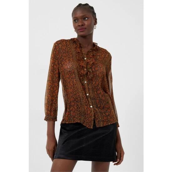 This classic button down sheer blouse is elevated with detailed snakeskin print and finished with a simple nod to trend with front ruffle detail. Bracelet length sleeves and grandad collar give a easy to wear shape, dress up for an evening out or easily worn to the office with a simple camisole underneath.