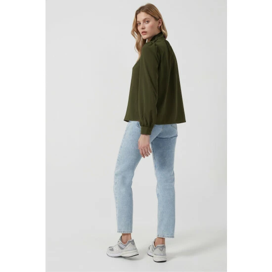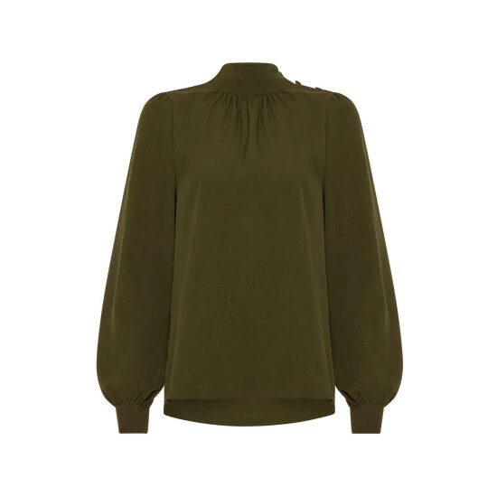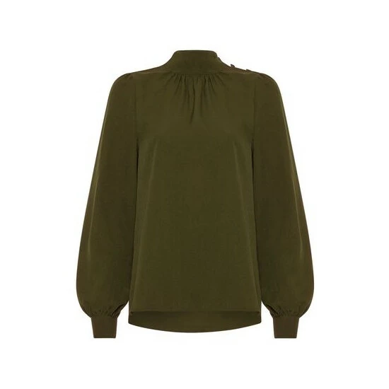 The Arina solid button-neck top makes office dressing an effortless experience. With a minimalist draped silhouette and buttoned cuffs, it is a sure-fire choice for weekdays.