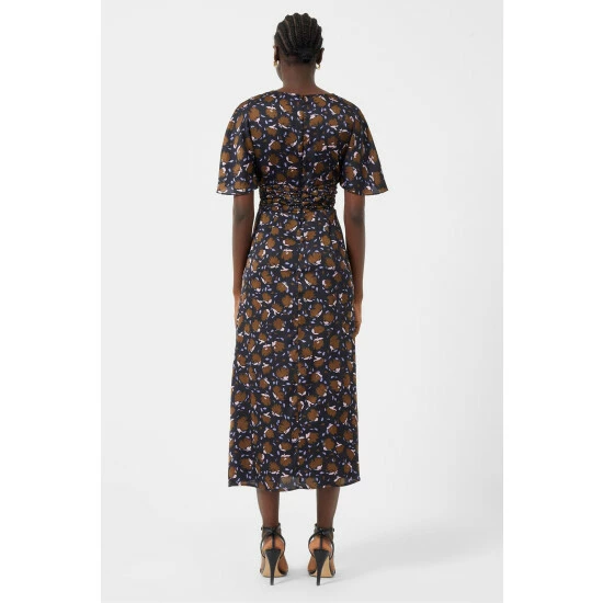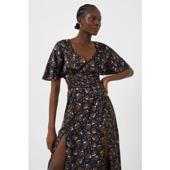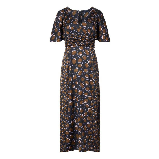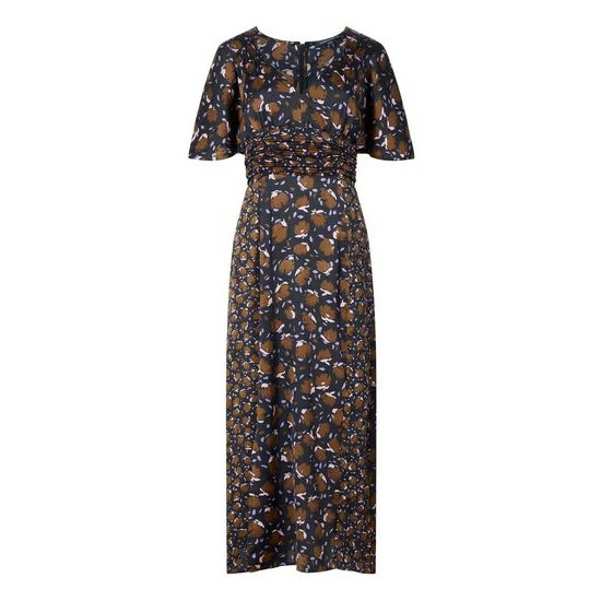 The Ingrid Inu satin drape fluted-sleeve midi dress has alluring feature panels pretty volume sleeves and a gathered mid-section. The soft V-neck and floor-sweeping hem are perfect with knee-high boots and evening sandals alike.